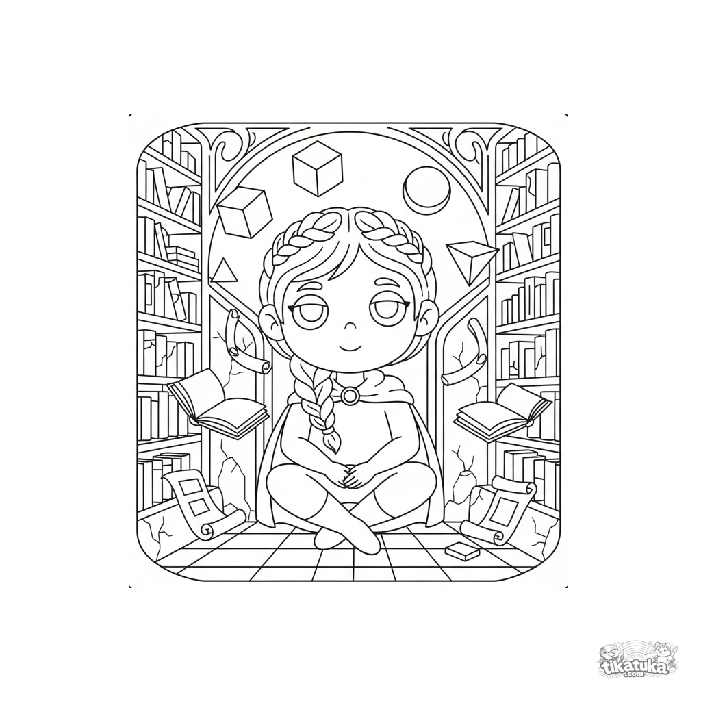 Página para colorear para preadolescentes 7-9: un héroe psíquico flota en una biblioteca antigua en ruinas, con formas geométricas y pergaminos orbitando a su alrededor.