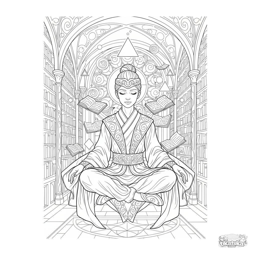 Página compleja para colorear para 10-12 años: un héroe psíquico medita flotando en una biblioteca antigua, rodeado de libros y formas geométricas orbitantes. Escena serena y detallada.