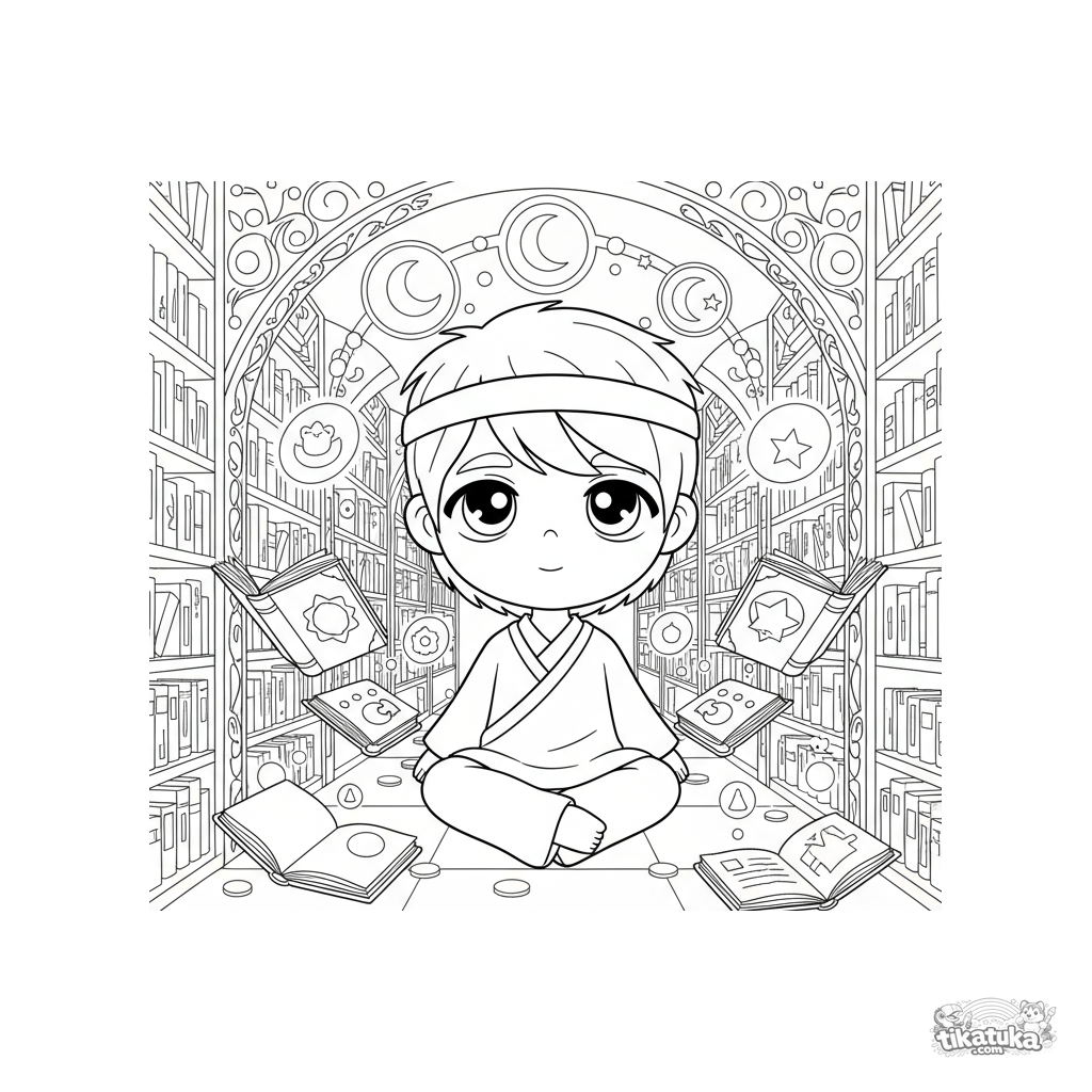 Página para colorear para niños 4-6: un superhéroe psíquico medita en el centro de una biblioteca flotante mágica, rodeado de libros levitantes.