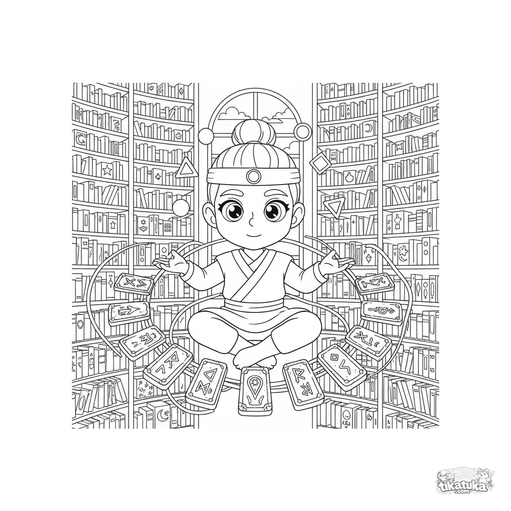 Página para colorear para 10-12 años: un superhéroe con poderes psíquicos resuelve un rompecabezas de tablillas de piedra flotantes en una antigua biblioteca.