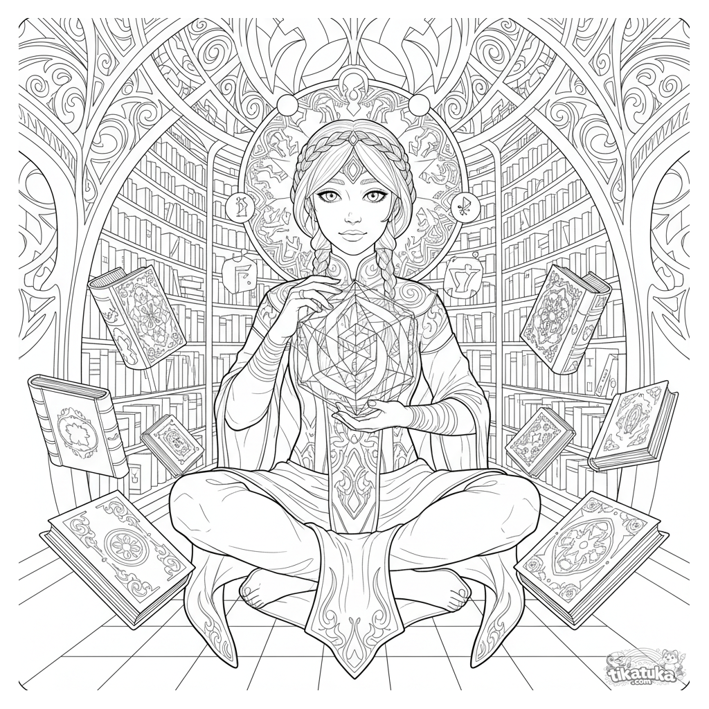 Página para colorear para niños mayores 10-12: un superhéroe psíquico usa poderes mentales para armar un rompecabezas luminoso en una biblioteca flotante. Detalles intrincados.