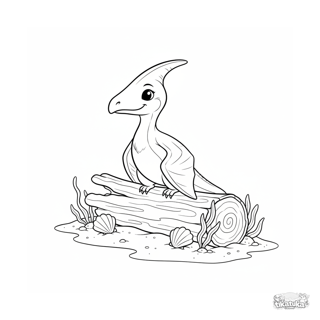 Página para colorear para niños 7-9: un pteranodón descansando en un gran tronco a la deriva en la playa arenosa de un océano antiguo. Escena tranquila.
