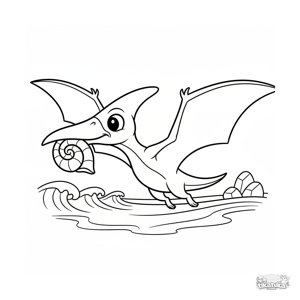 Página para colorear para 7-9 años: un pterodáctilo deslizándose sobre una playa antigua, llevando una concha grande y brillante en el pico. Escena dinámica estilo papel cortado.