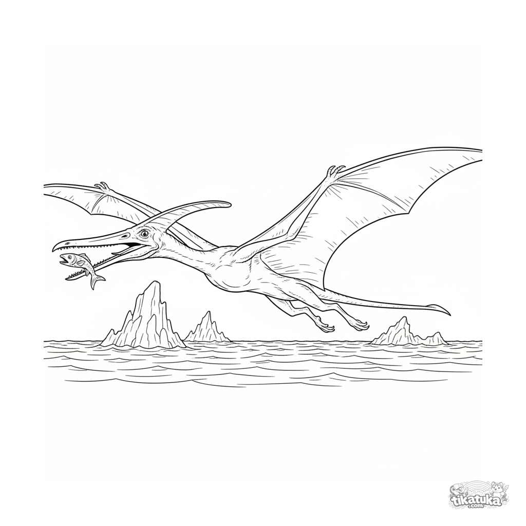 Página detallada para colorear para niños 10-12: un pterosaurio en vuelo atrapa un pez en las olas de una orilla arenosa antigua. Estilo naturalista.