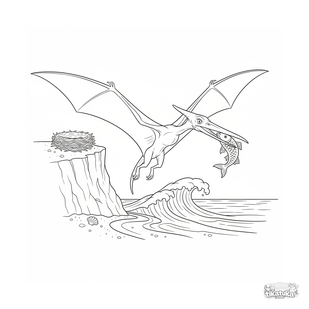 Página para colorear para niños de 7-9 años: un pterosaurio vuela sobre olas oceánicas antiguas, llevando un pez a su nido en un acantilado arenoso. Detalle moderado.