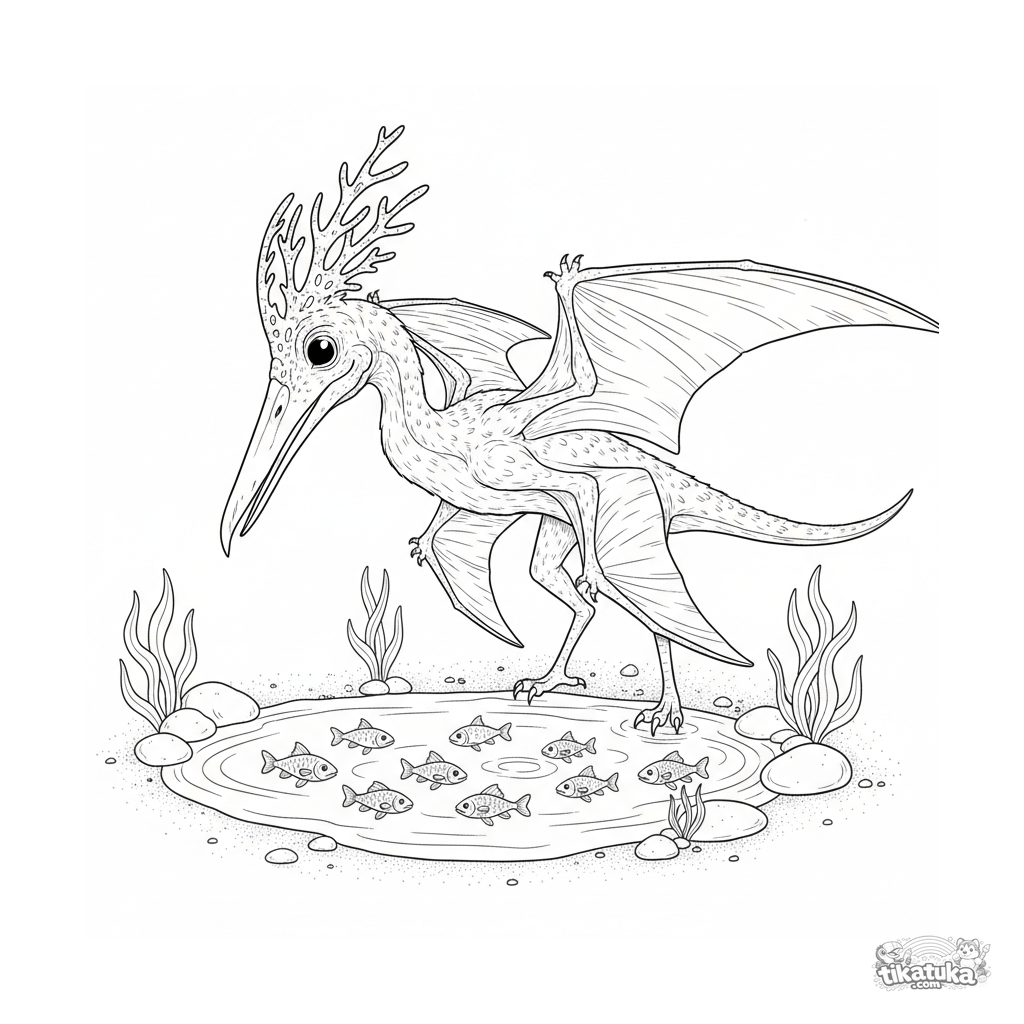 Página para colorear detallada para 10-12 años: un pterosaurio caza peces en pozas de marea en la orilla arenosa de un océano antiguo. Estilo de ilustración científica.