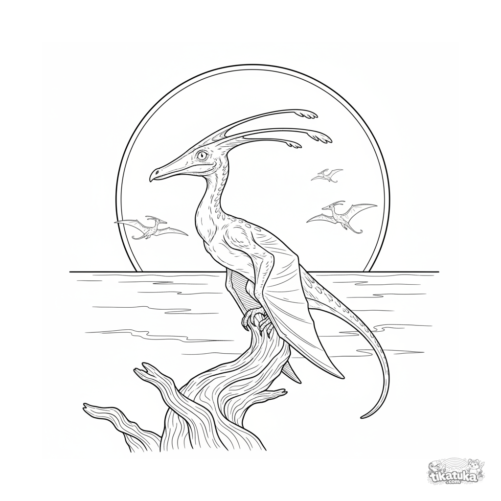Página detallada para colorear para niños de 10-12 años: un pterosaurio descansa en madera flotante en una playa antigua al atardecer. Estilo realista, alto detalle.