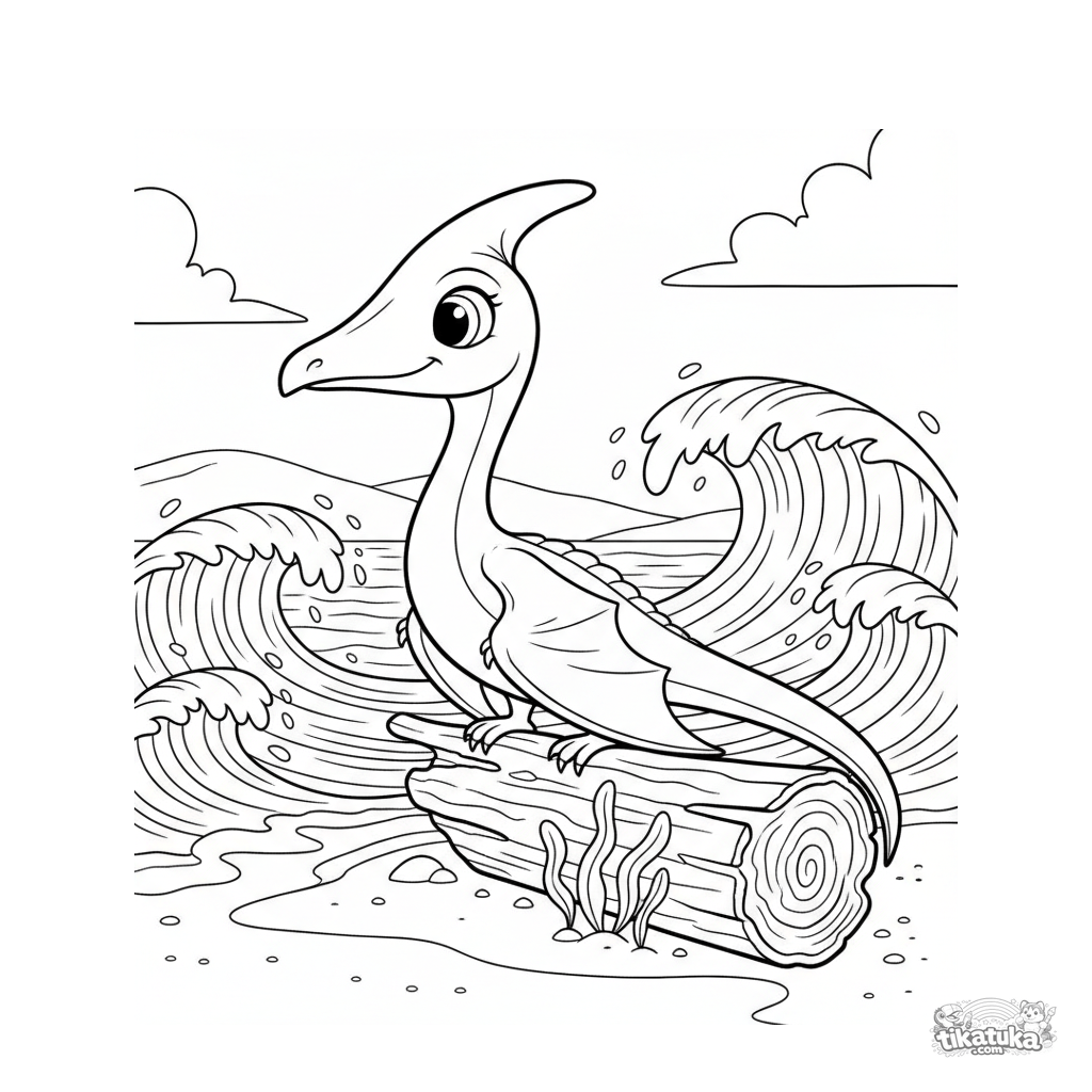 Página para colorear para 7-9 años: un pterosaurio se posa en madera a la deriva, observando las olas de un océano antiguo. Escena estilo libro ilustrado con algas.