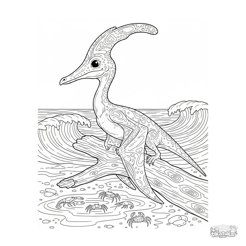 Página para colorear para 10-12 años: un pterosaurio con alas correosas posado en madera a la deriva en una playa antigua, observando la vida en una charca de marea.