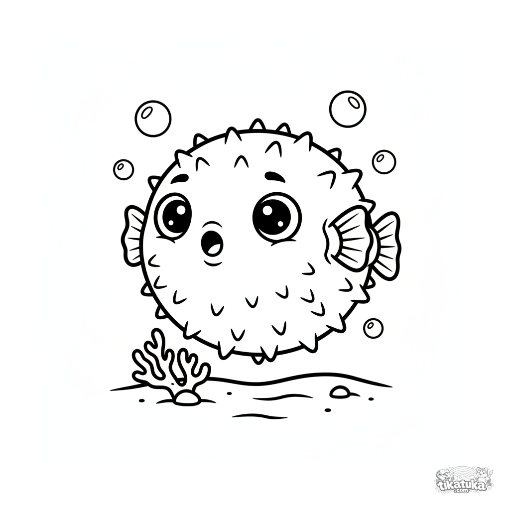 Página para colorear simple de un pez globo redondo cerca del coral en aguas poco profundas. Formas grandes, contornos gruesos, para niños pequeños de 2-3 años.