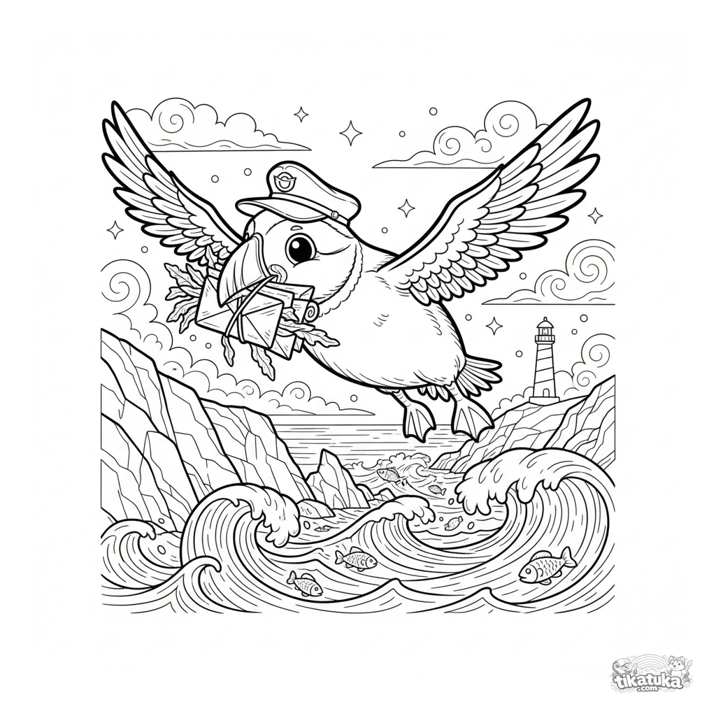 Página para colorear de un frailecillo cartero sobre acantilados rocosos. Para niños mayores de 7-12 años. El pájaro con gorra lleva cartas de algas, con un faro a lo lejos.