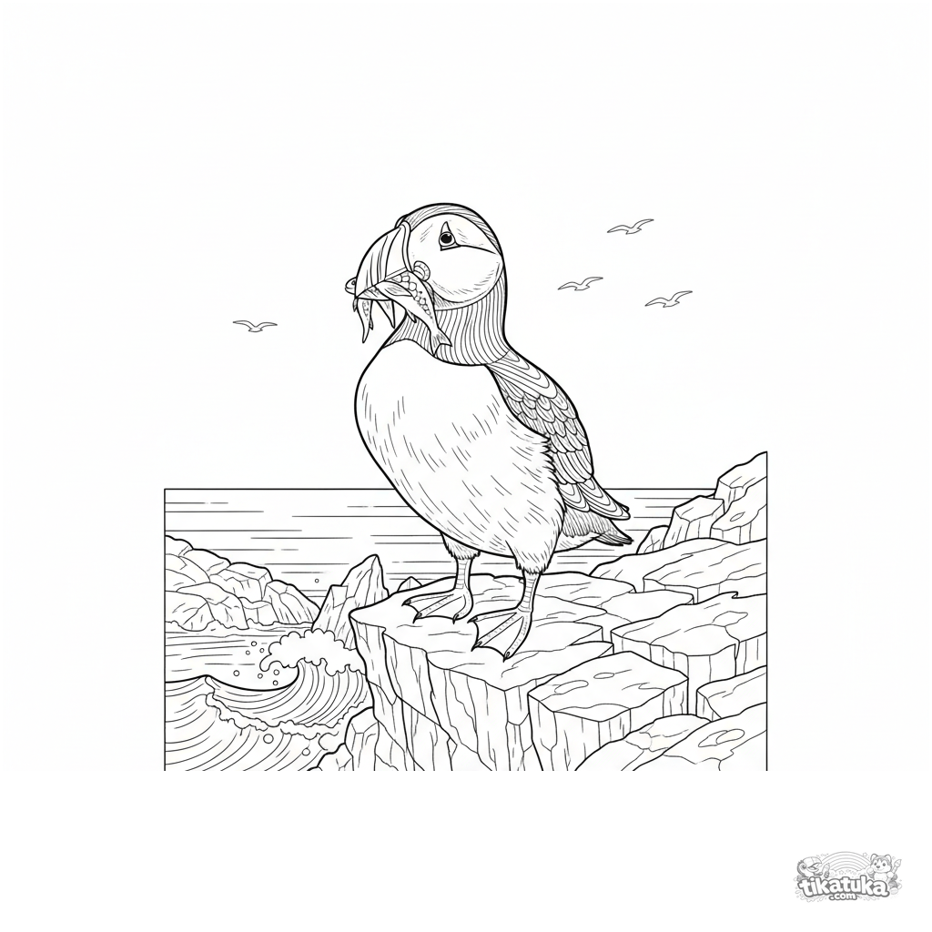 Página detallada para colorear de un frailecillo en un acantilado rocoso para niños de 7 a 12 años. El pájaro sostiene un pez en su pico con el fondo de las olas del océano.