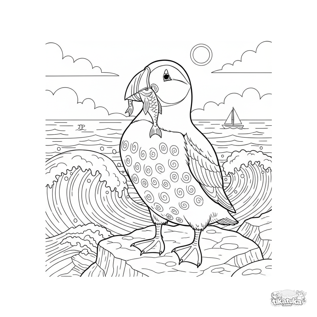 Página detallada para colorear un frailecillo para niños de 7 a 12 años. Muestra el pájaro en un acantilado rocoso sosteniendo un pez en su pico, con océano y olas al fondo.