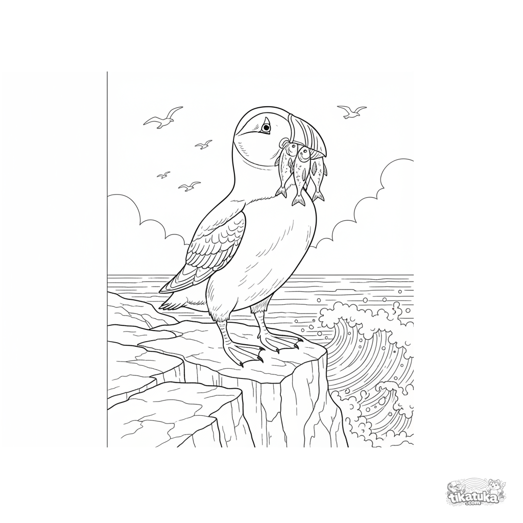 Página detallada para colorear para niños mayores de 7-12 años: un frailecillo realista en un acantilado con el pico lleno de peces.