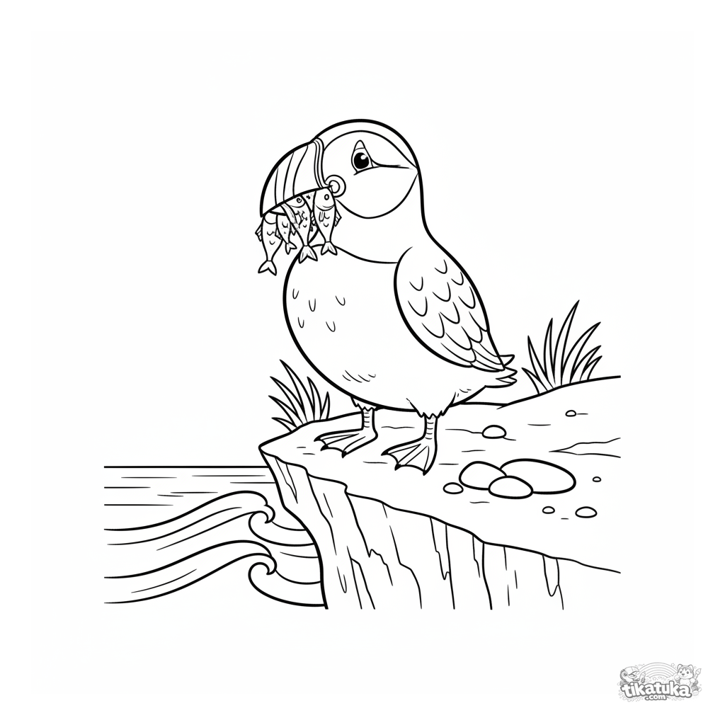 Página detallada para colorear para niños de 7 a 12 años: un frailecillo con el pico lleno de peces en un acantilado rocoso sobre el océano. Muchas texturas y elementos interesantes.