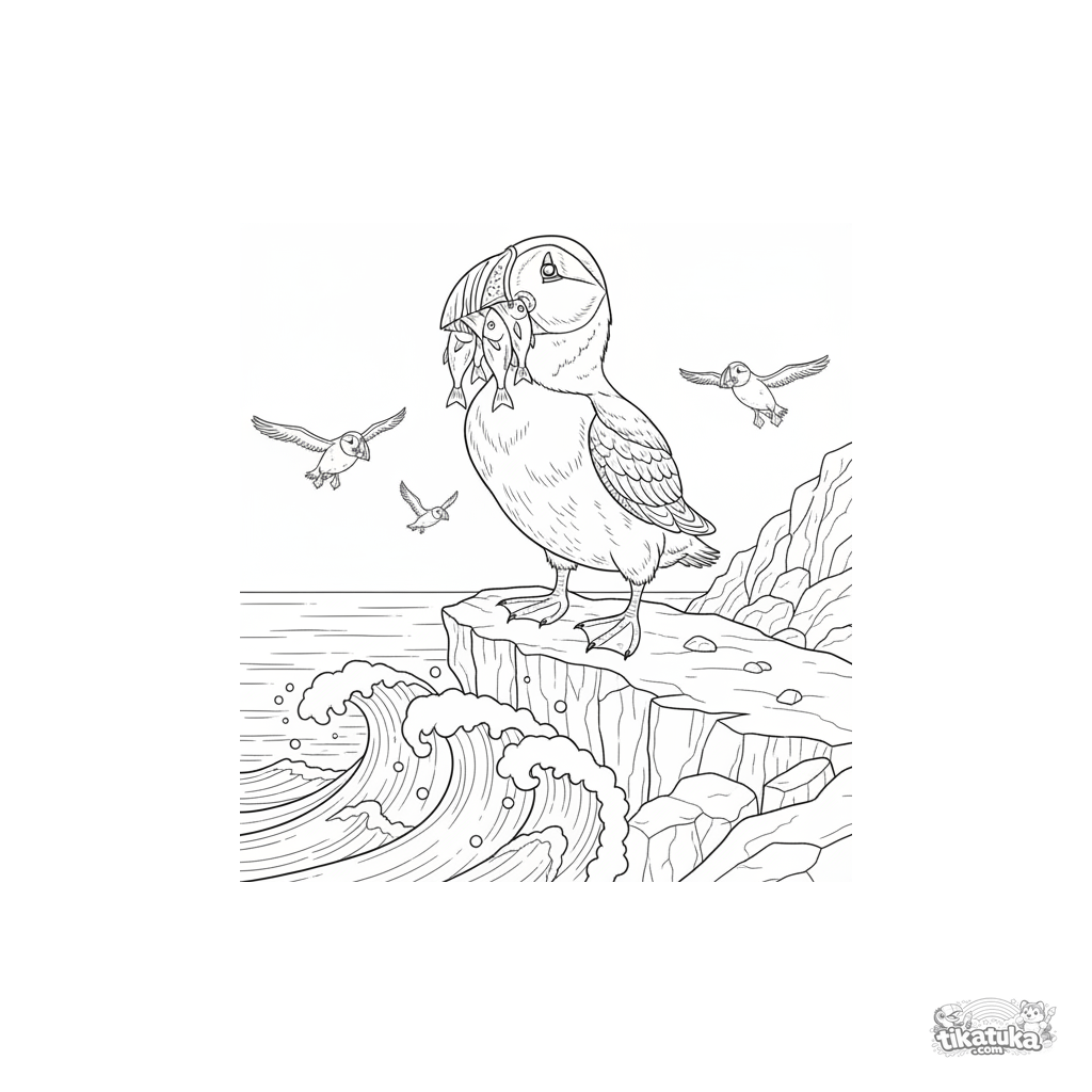 Página para colorear de un frailecillo con pescado en el pico en un acantilado rocoso. Para niños mayores de 7 a 12 años. Escena detallada con olas.