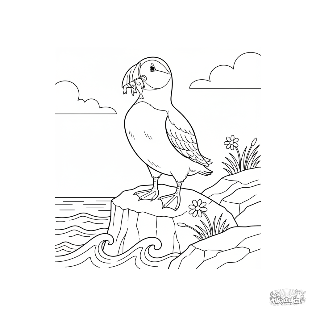 Página para colorear para niños de 4-6 años: un frailecillo con pico rayado se para en un acantilado rocoso con un pez pequeño.