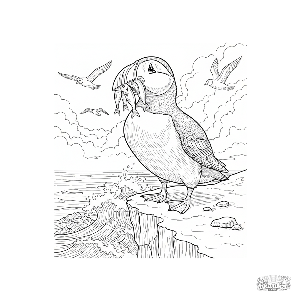 Página para colorear difícil para niños de 7 a 12 años con un frailecillo. El pájaro con pescado capturado en el pico está parado en el borde de un acantilado rocoso sobre el mar agitado.
