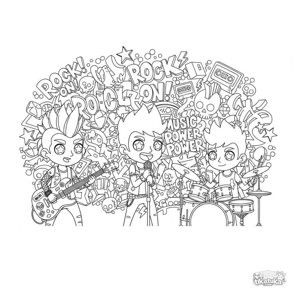 Página para colorear para niños de 7-12 años: una banda punk-lite de tres miembros ensayando frente a un mural de graffiti. Escena detallada con guitarra, micrófono y batería.