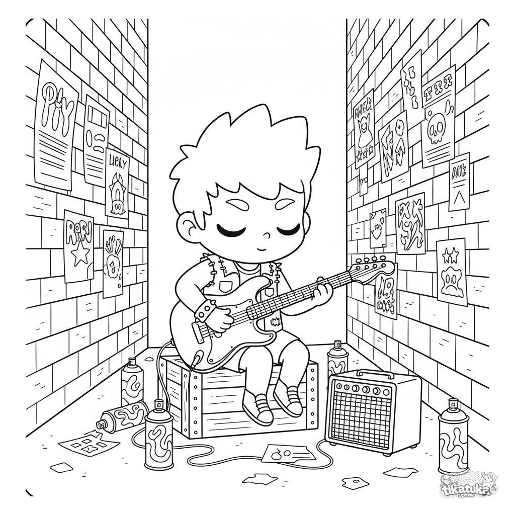Página para colorear para niños de 7 a 12 años: un chico punk-lite tocando una guitarra eléctrica en un callejón de ladrillo. Escena detallada con un amplificador de práctica, latas de spray y texturas urbanas.