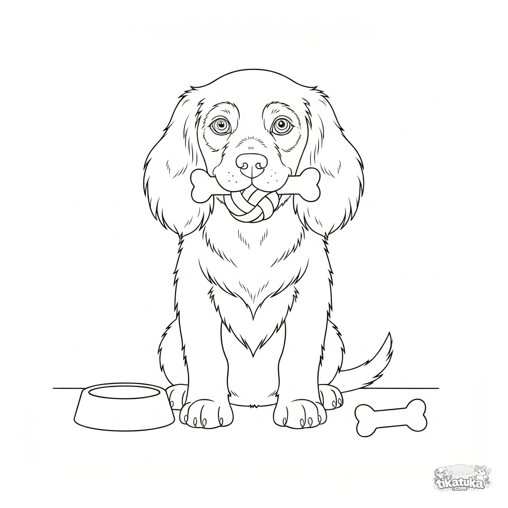 Página para colorear de cachorro estilo realista para 3-5 años. Cachorro con orejas caídas tiene un juguete, con un cuenco cerca. Detalles bajos.