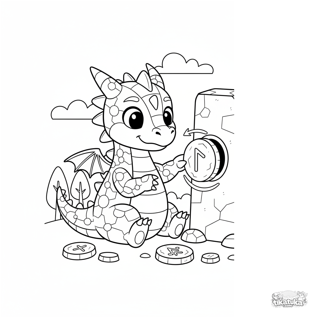 Página para colorear para preadolescentes de 7-9 años: un dragón con escamas de pieza de rompecabezas intenta encajar una llave rúnica en un antiguo monolito. Tema geométrico interesante e historia.