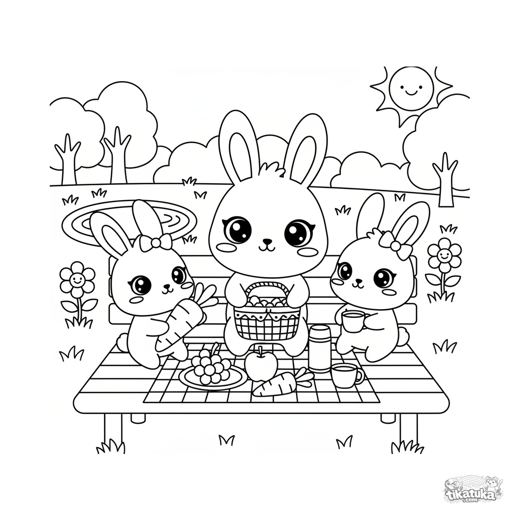 Página para colorear para niños 7-9: una familia de conejos teniendo un picnic en un banco. Escena cálida y amigable.