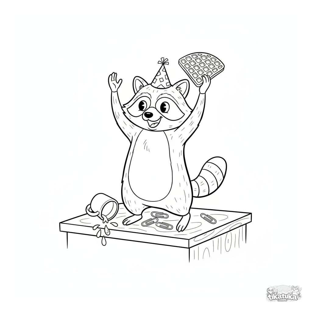 Página para colorear para niños: un mapache con un gorro de papel celebra en un escritorio de oficina con un waffle. Escena absurda y alegre en estilo retro de manguera de goma.