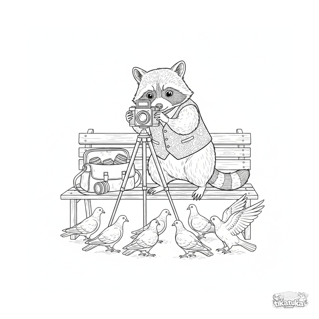 Página detallada para colorear para niños 10-12: un mapache fotógrafo con una cámara antigua en un banco del parque. Estilo de grabado vintage.