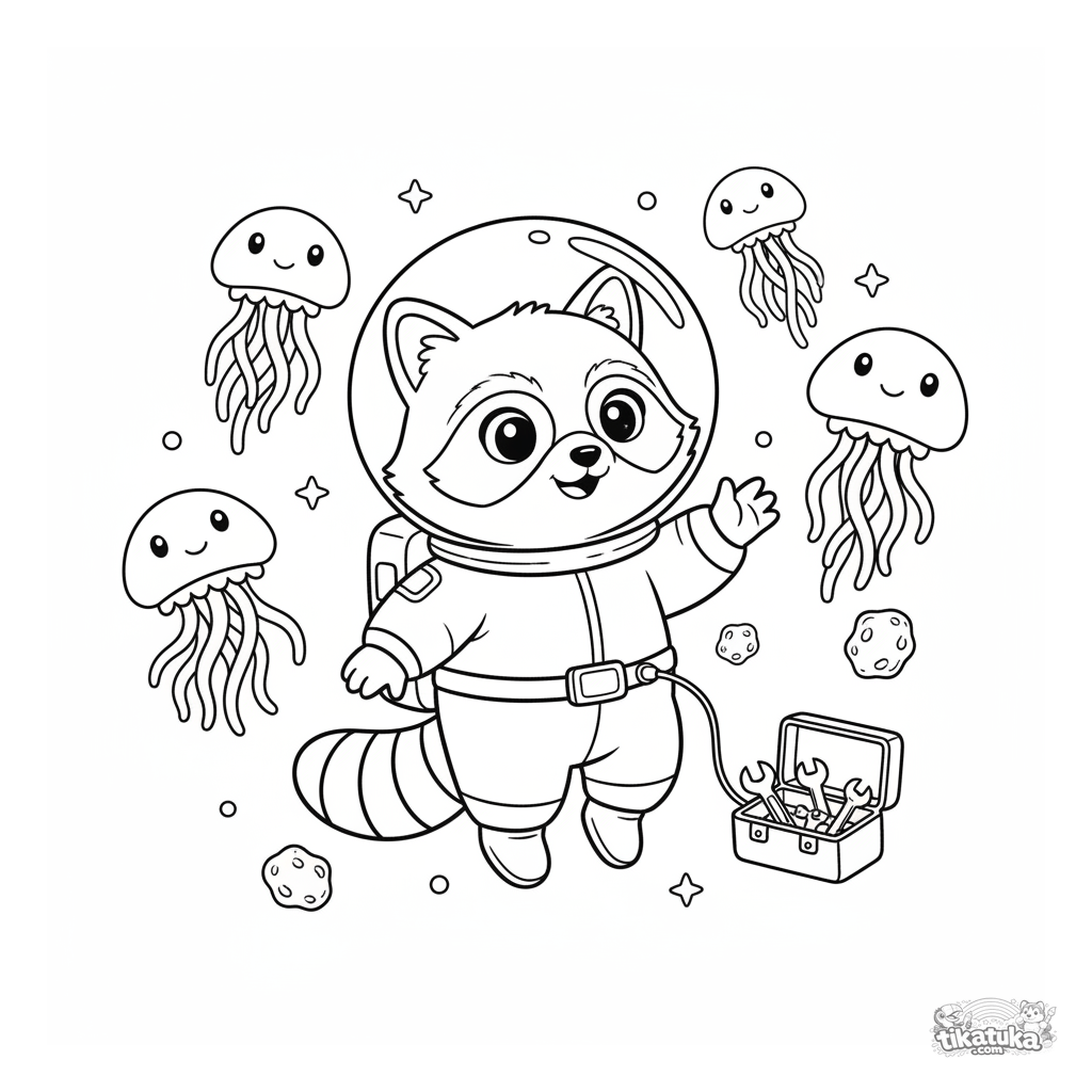 Página para colorear con el mapache inventor Shmyak como astronauta flotando entre medusas espaciales. Para niños de 4 a 8 años.