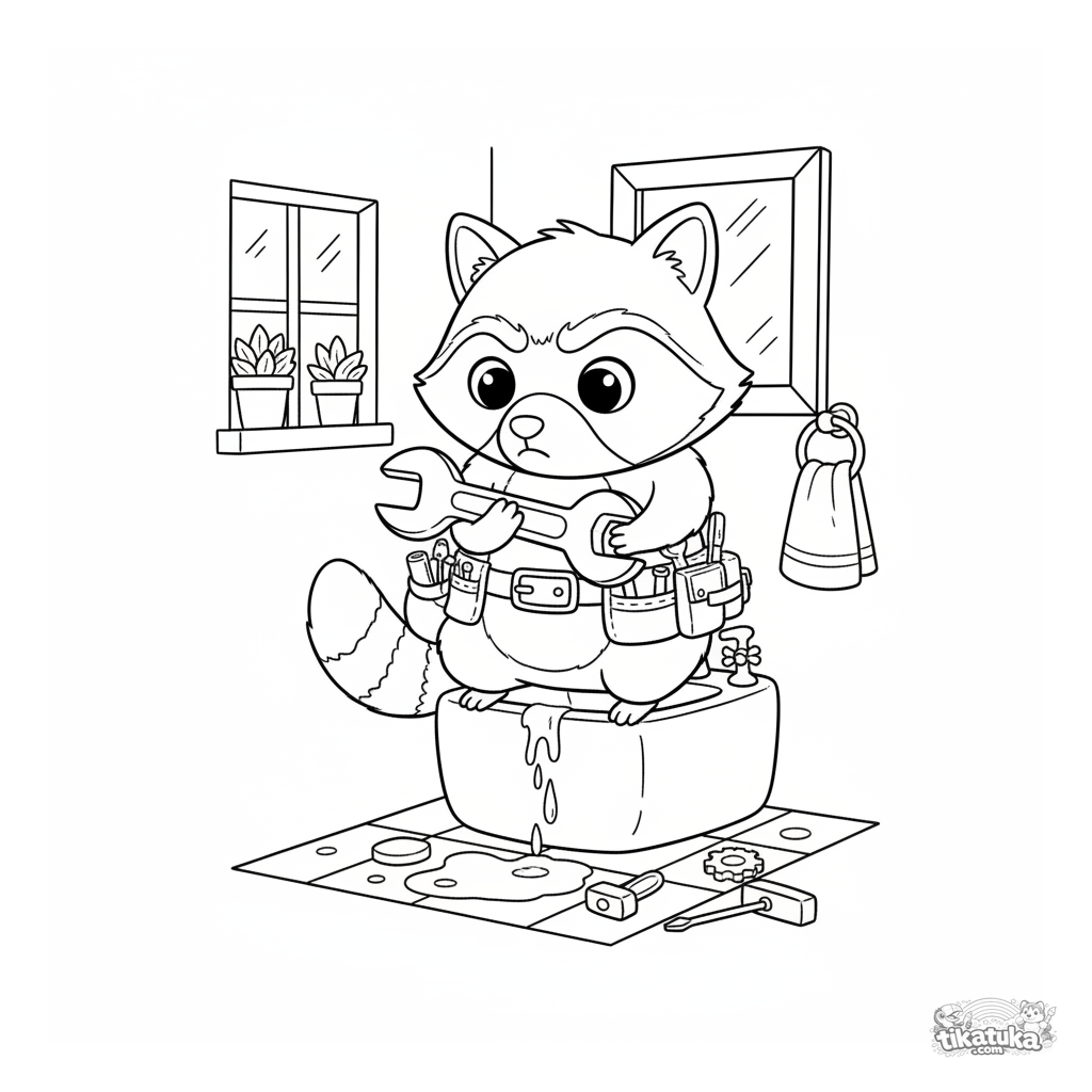 Página para colorear para niños de 4-6 años: el mapache manitas Shmyak arreglando un grifo que gotea en un baño.