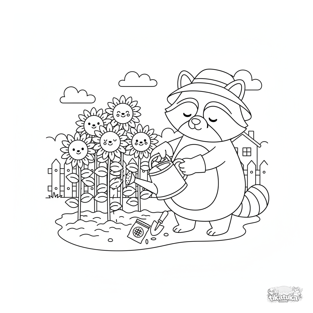 Página para colorear para niños: el mapache Shmyak con guantes de jardinería y sombrero riega altos girasoles en un jardín. Escena tranquila, formas simples, para 4-8 años.