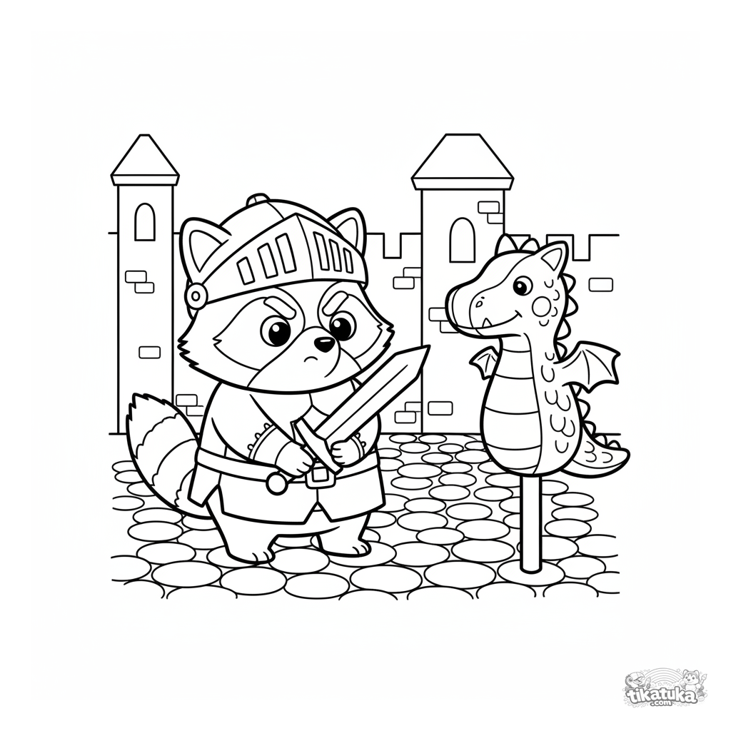 Página para colorear para niños de 4-6 años: el caballero mapache Shmyak con armadura entrena con una espada de madera contra un maniquí de dragón de peluche.