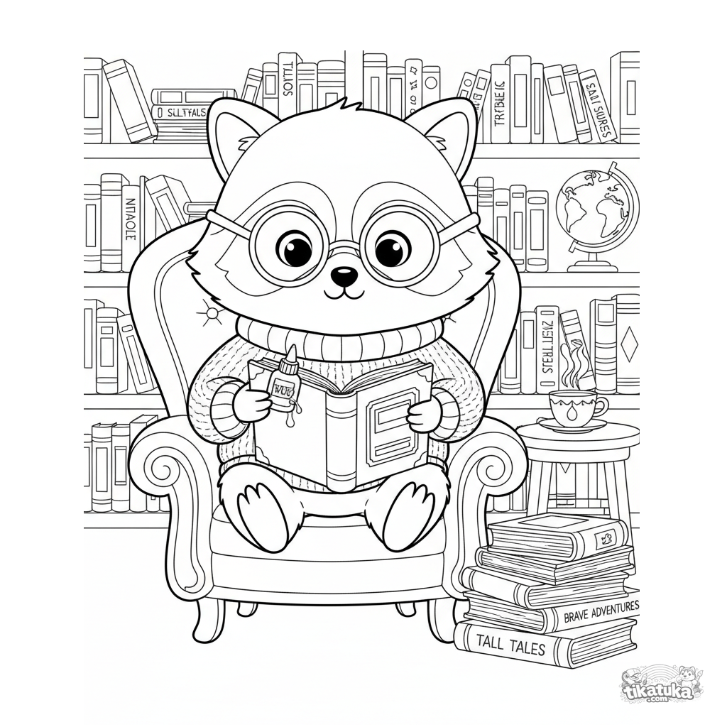 Página para colorear con el mapache bibliotecario Shmyak en un rincón de libros acogedor. Para niños de 4 a 8 años.