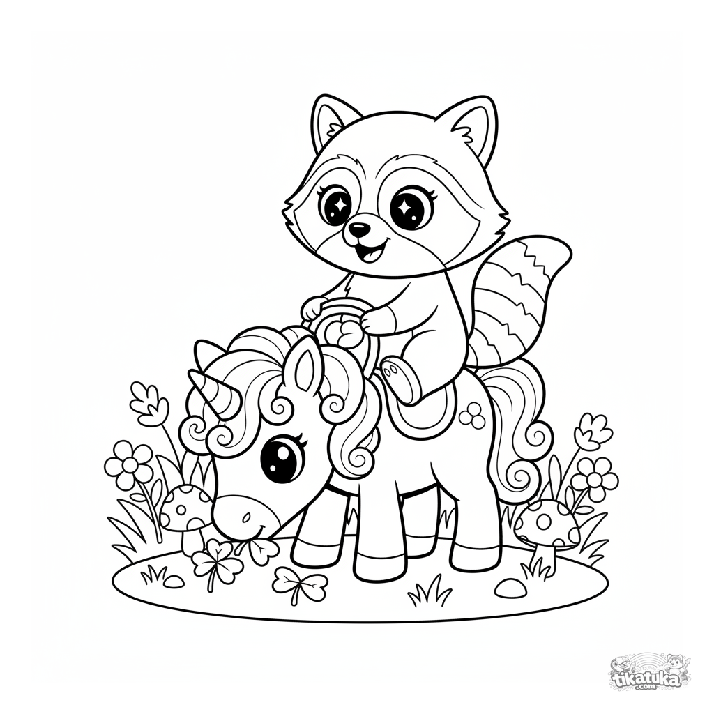 Página para colorear para niñas de 4-6 años: el mapache Shmyak monta un pony mágico y bondadoso con crin rizada en un prado florido.