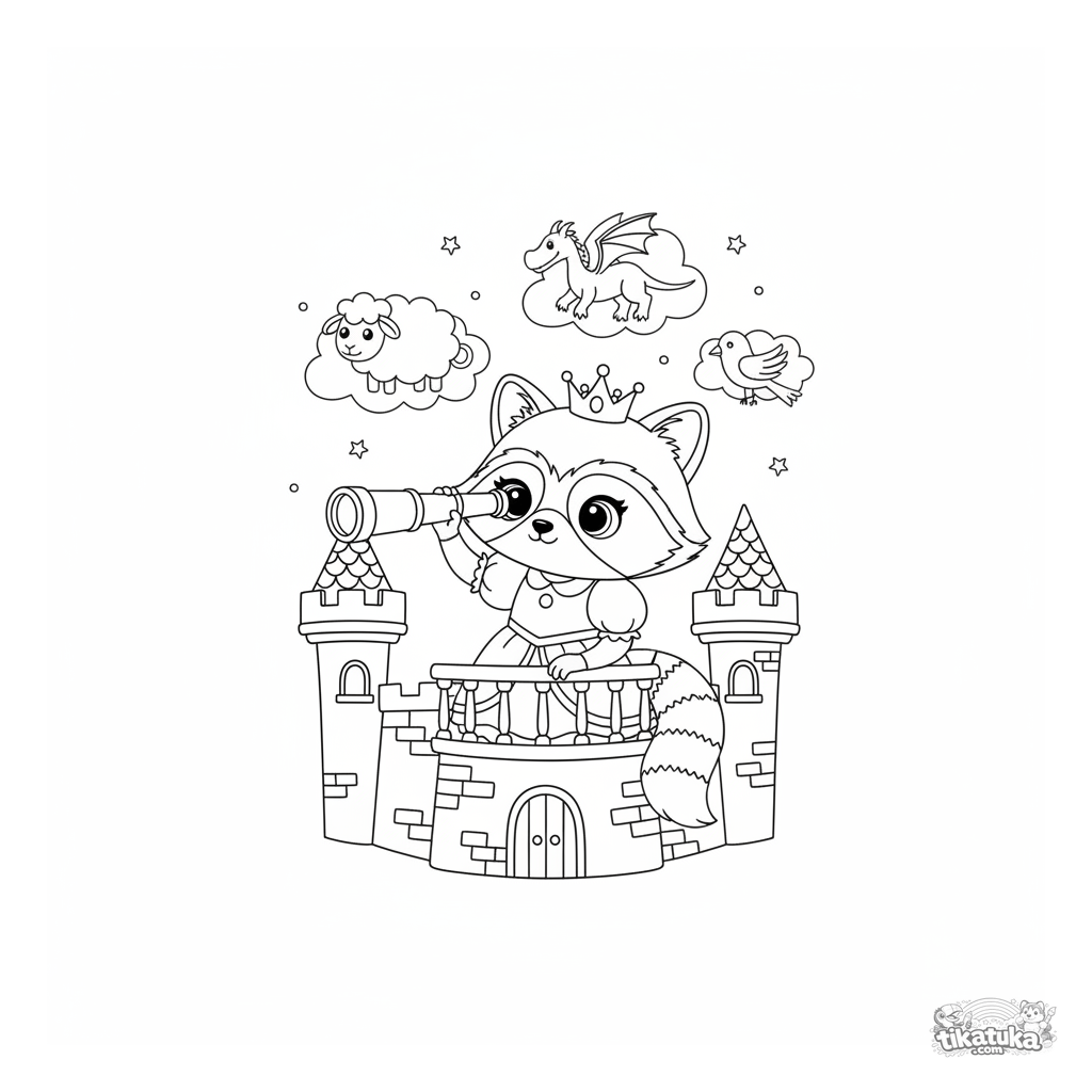 Página para colorear para niñas de 4-6 años: la princesa mapache Shmyak con corona mira por un telescopio desde el balcón de un castillo de juguete.