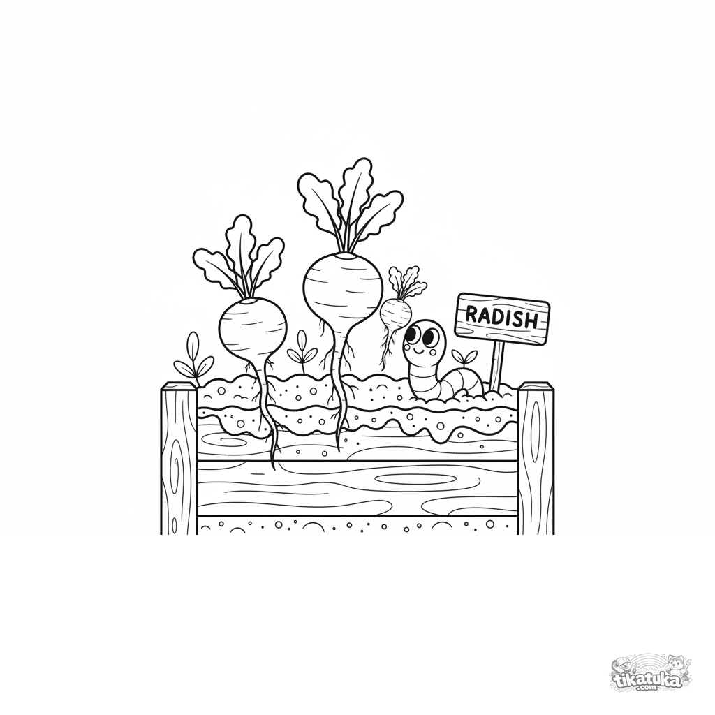 Página educativa para colorear para 7-9 años: una familia de rábanos creciendo en la tierra. Muestra raíces y suelo en estilo juguete de madera.