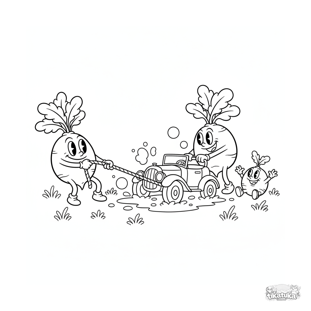 Página para colorear para 7-9 años: una familia divertida de rábanos rescata un coche pequeño del barro en el jardín. Estilo retro animado.