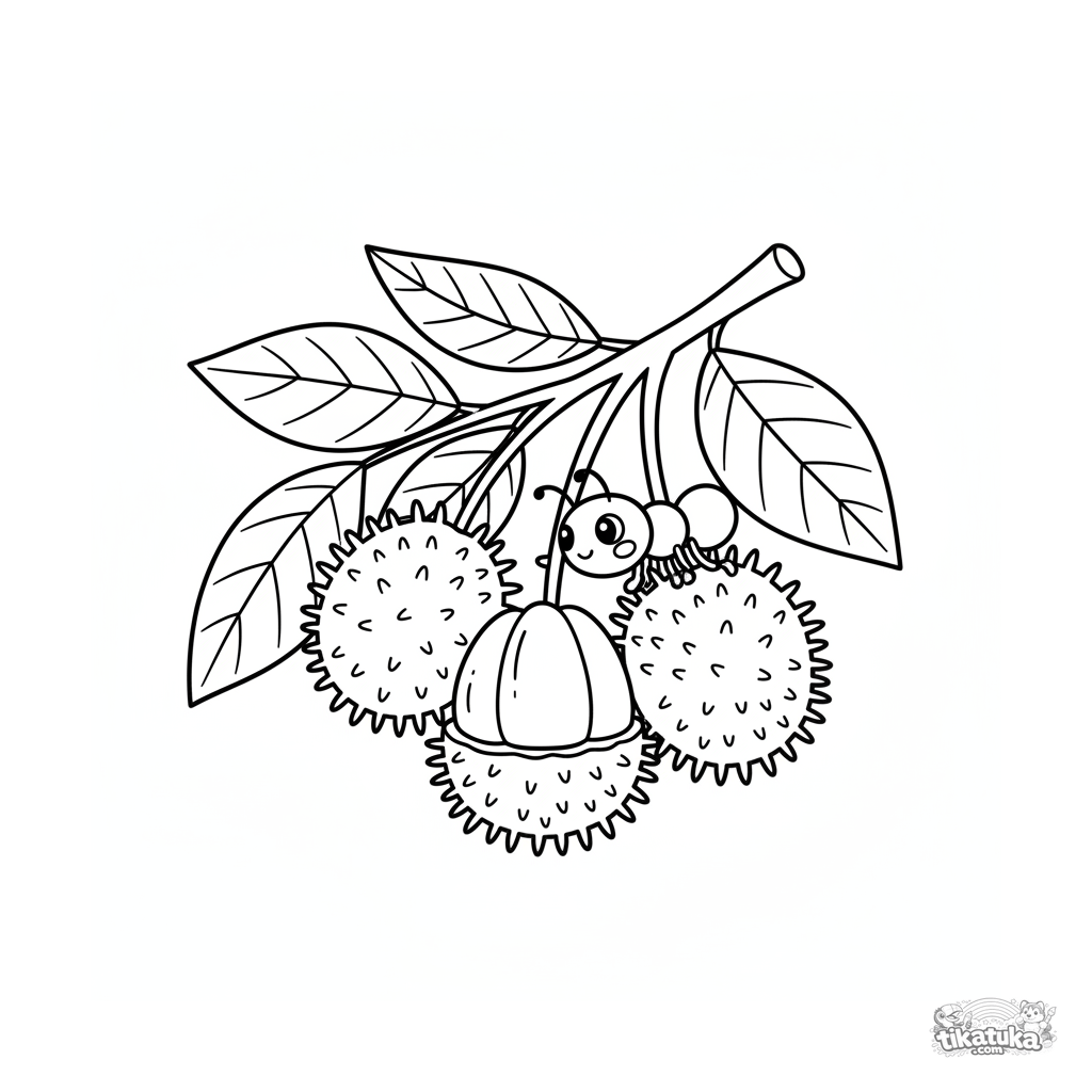 Página para colorear para niños pequeños: una rama con rambutanes espinosos y una pequeña hormiga amigable. Formas grandes y simples, márgenes amplios.