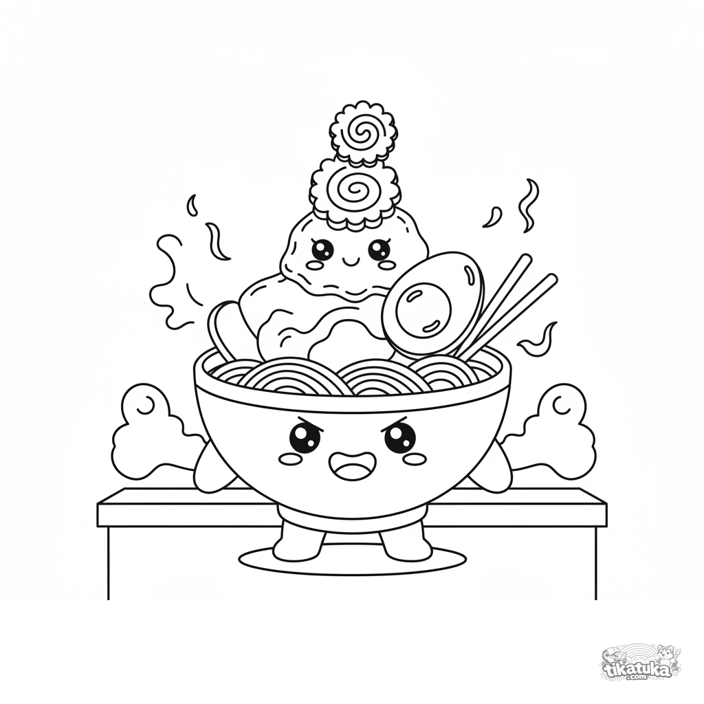 Página para colorear de un tazón de ramen equilibrando ingredientes. El tazón intenta sostener un huevo y pastel de pescado. Para niños 4-6.