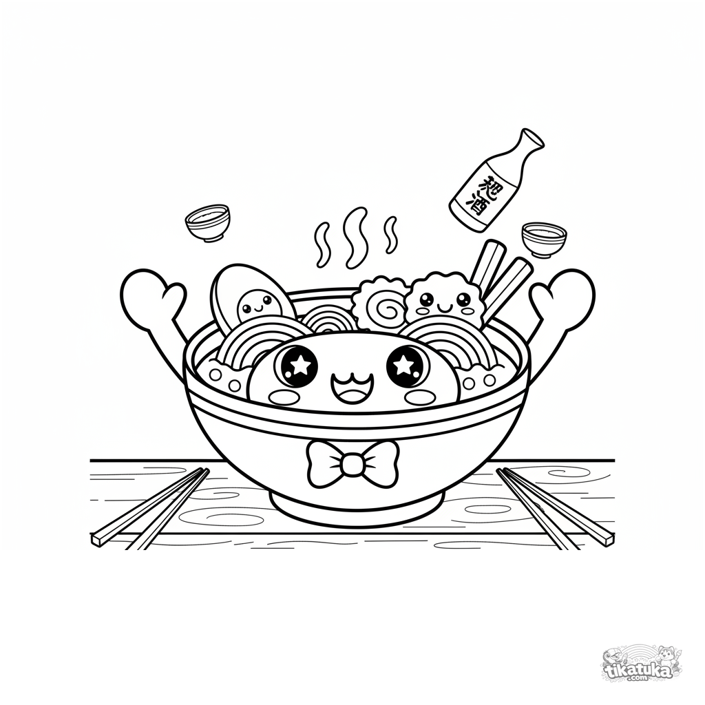 Página para colorear para niños: un tazón de ramen feliz con fideos saludando celebra en el mostrador de un restaurante. Escena brillante con huevo y pastel de pescado para niños de 4 a 6 años.