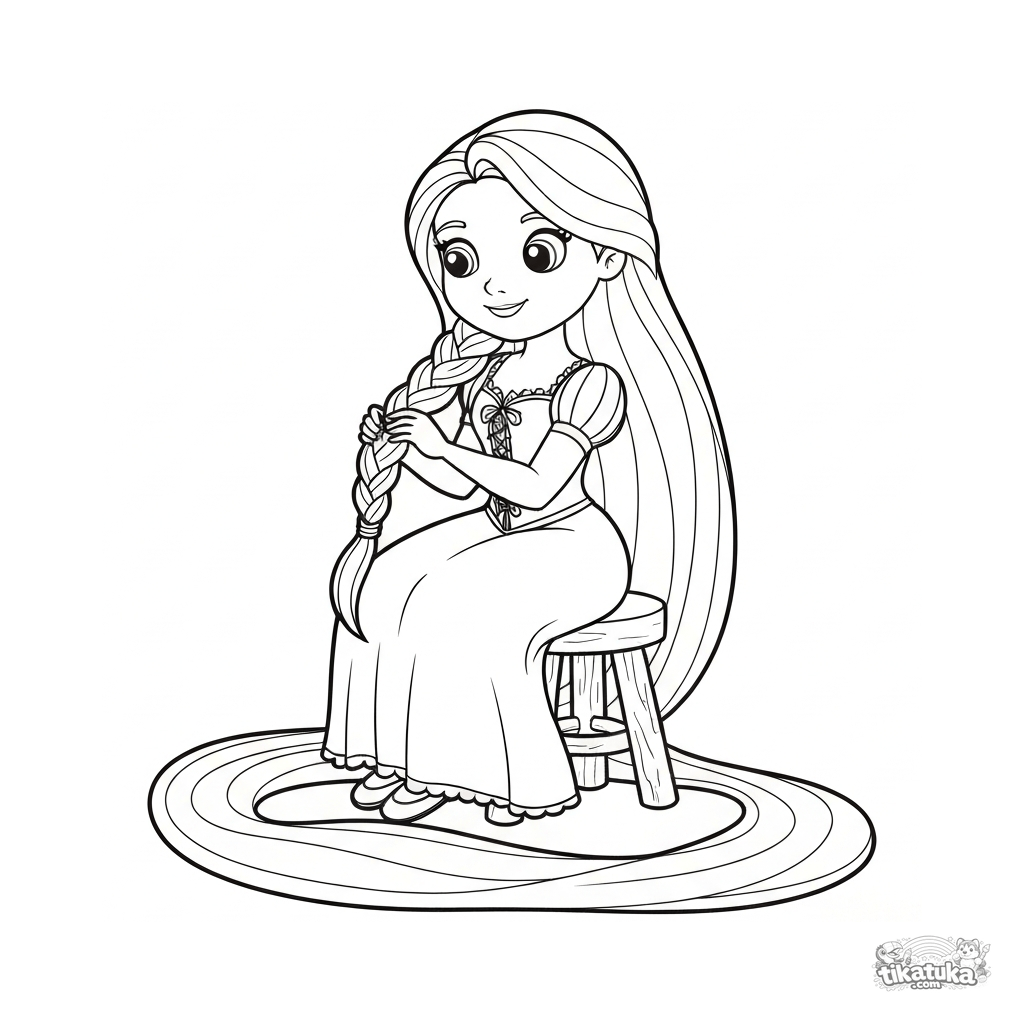Página para colorear para niños. Rapunzel en su torre trenzando su largo cabello rubio. Diseño simple para pequeños. Descarga gratis.