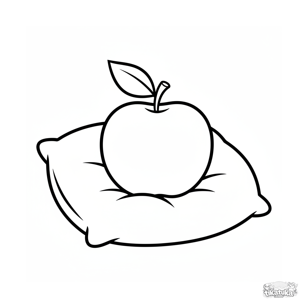 Página realista de manzana para los más pequeños. Un contorno simple de manzana con hoja en un cojín. Forma grande.