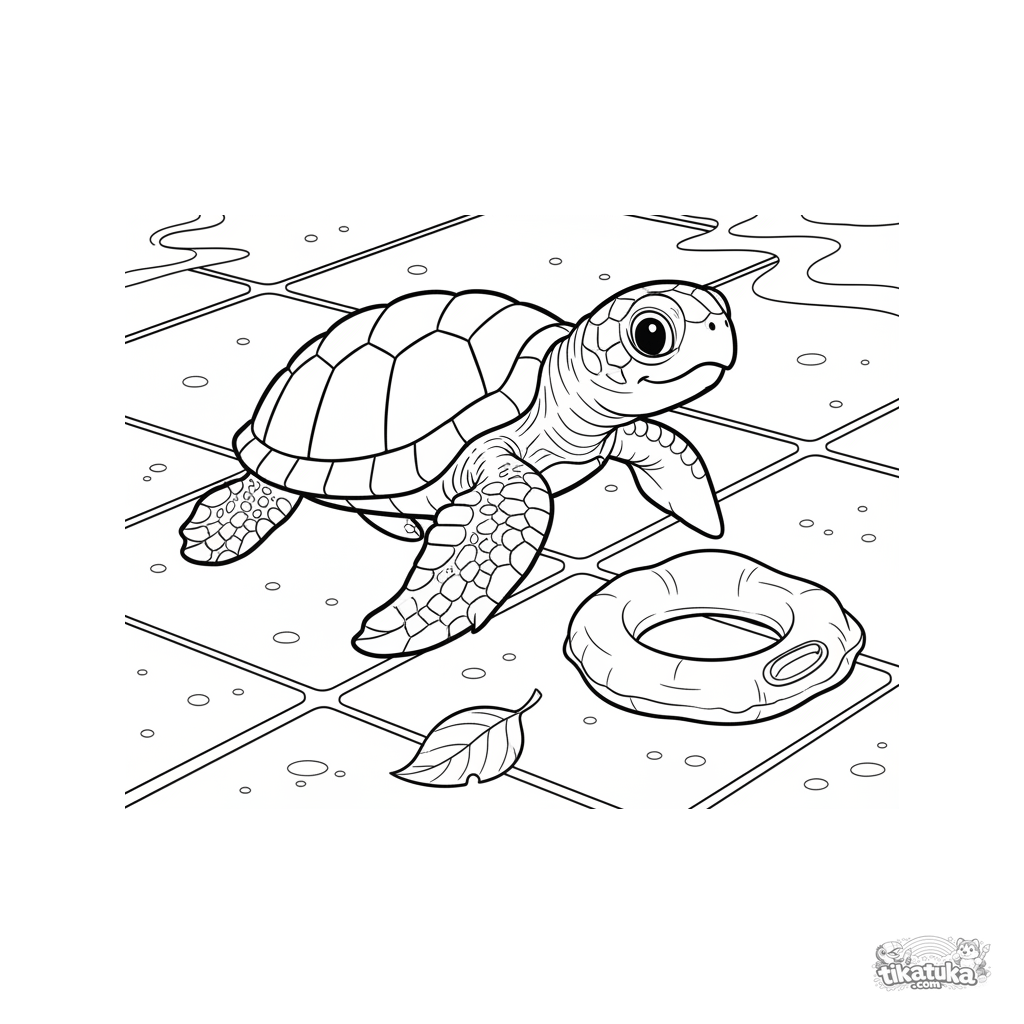 Página para colorear para niños de 7-9 años: una tortuga bebé es representada de manera realista explorando el fondo de una piscina. Patrones del caparazón, textura de azulejos y un flotador.
