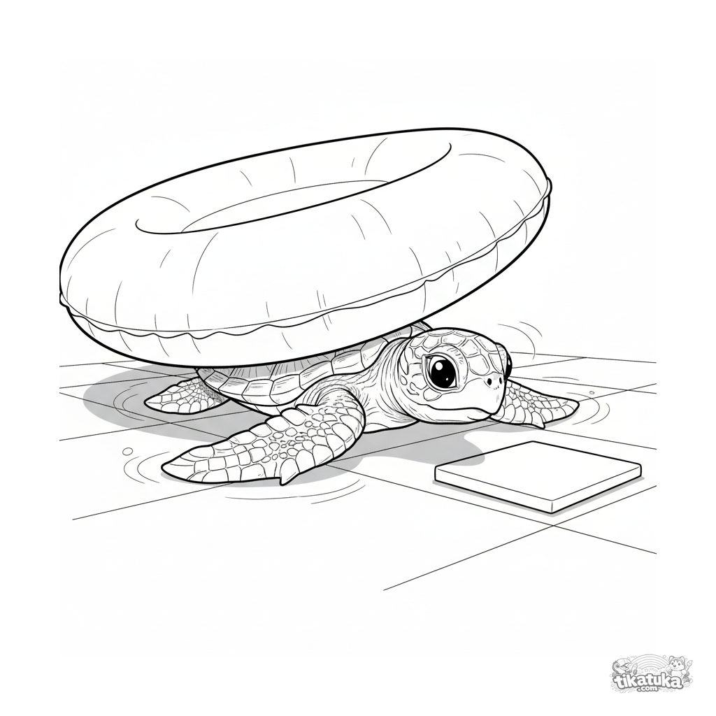 Página detallada para colorear para niños de 10-12 años: una realista tortuga bebé explora el espacio bajo un aro inflable en el fondo de la piscina.