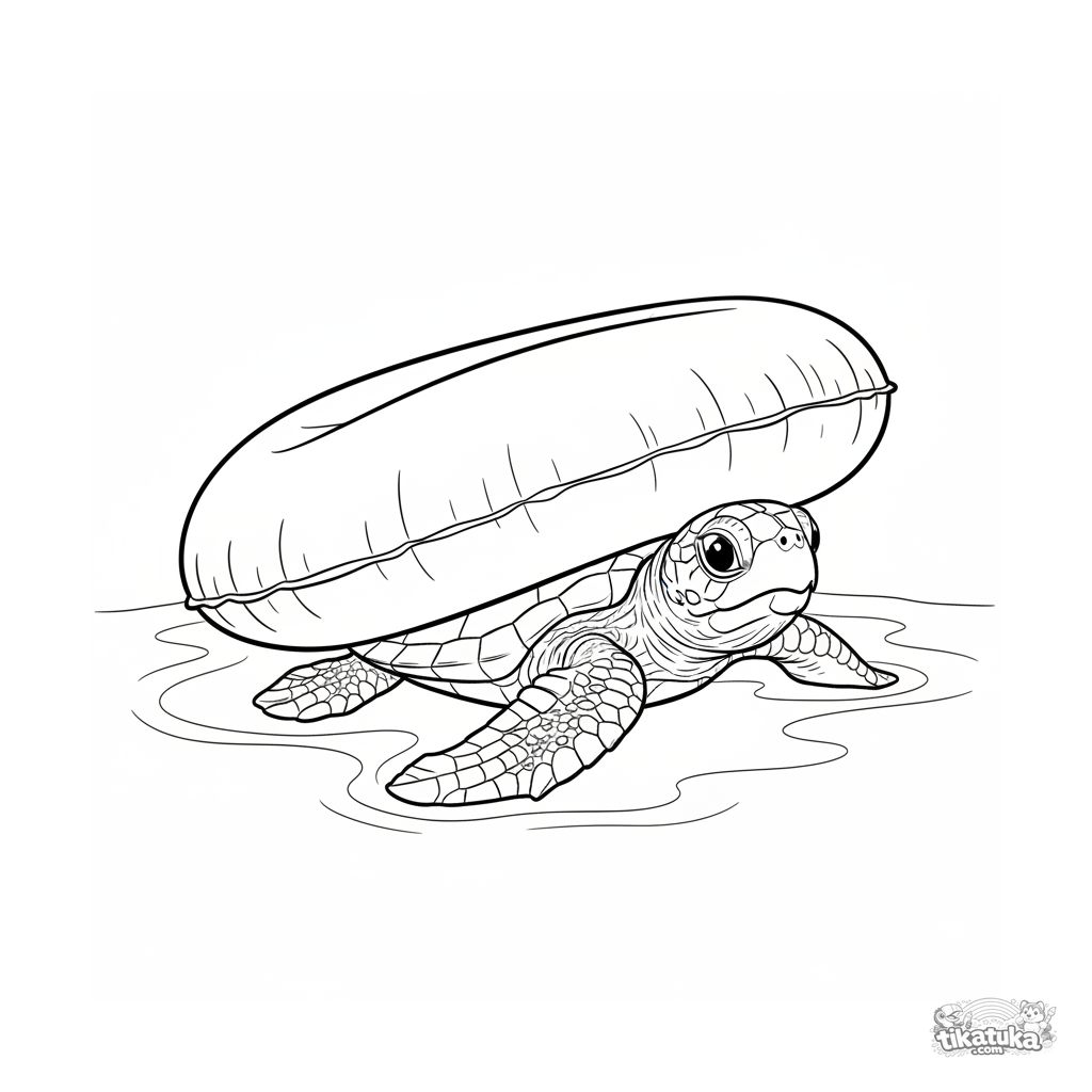 Página detallada para colorear para niños de 10-12 años: una tortuga bebé en estilo realista explora bajo un aro inflable en la piscina.