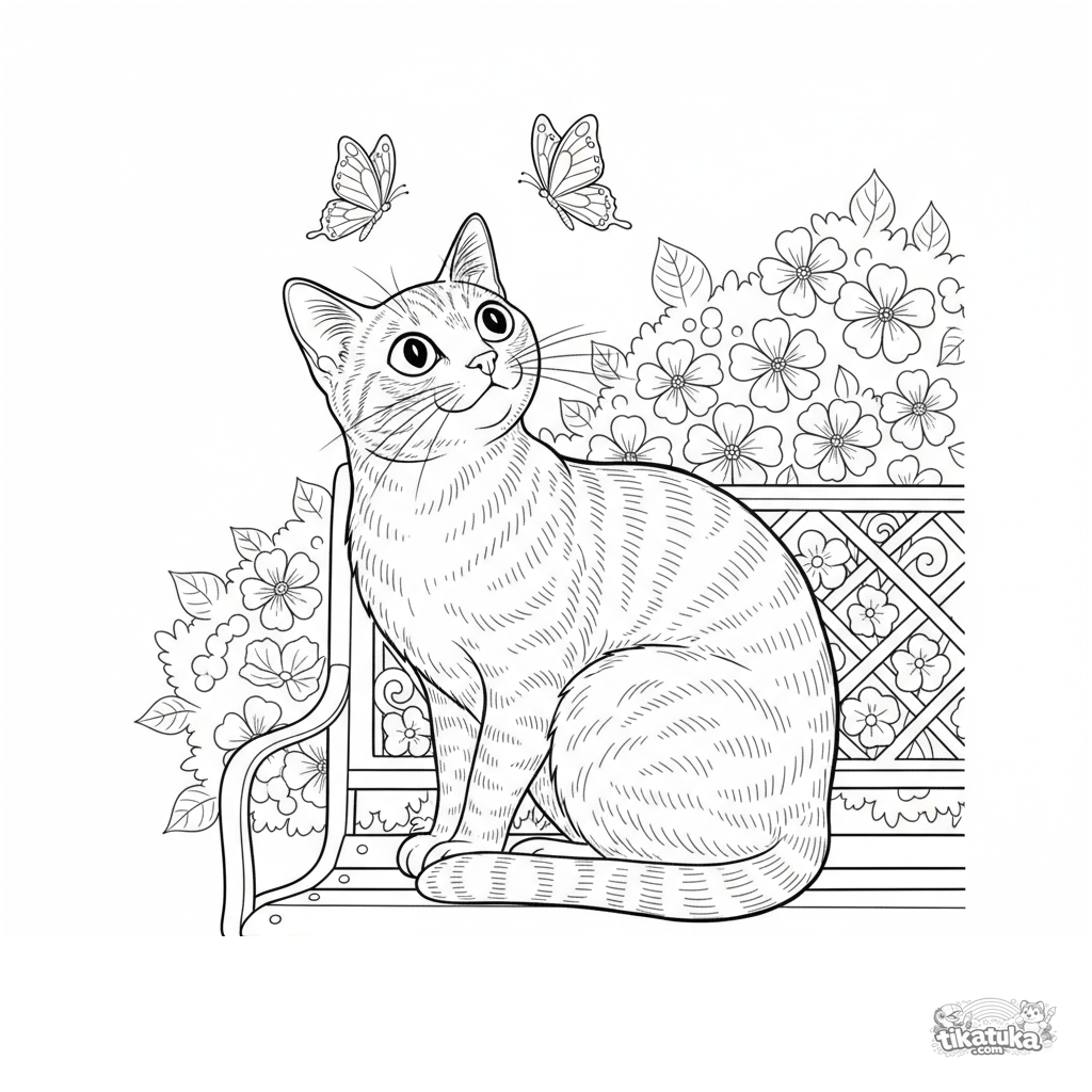 Página realista detallada para colorear para niños de 10-12 años: un gato observa atentamente a las mariposas sentado en un banco de hierro forjado.