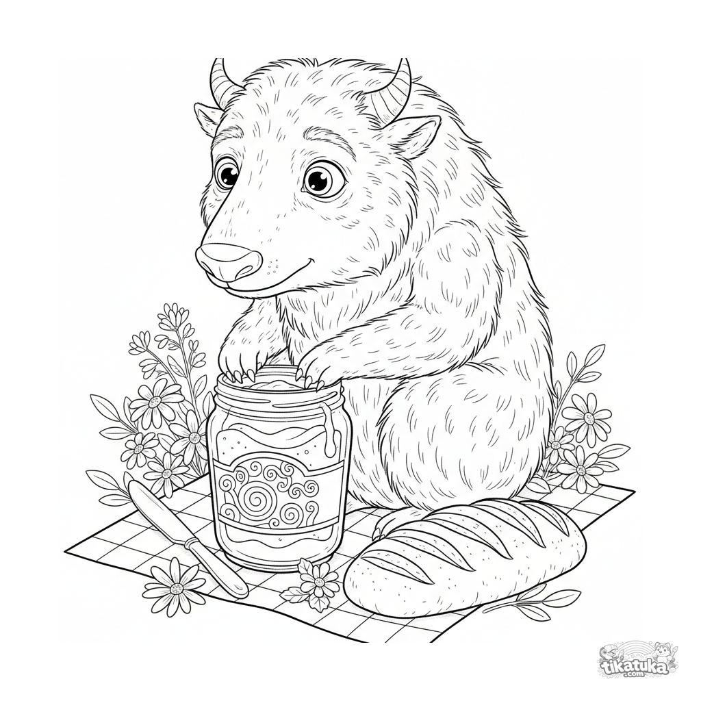 Página para colorear detallada en estilo realista: un monstruo peludo investiga con curiosidad un tarro de mermelada en un picnic. Para niños de 10 a 12 años, con texturas y múltiples elementos.