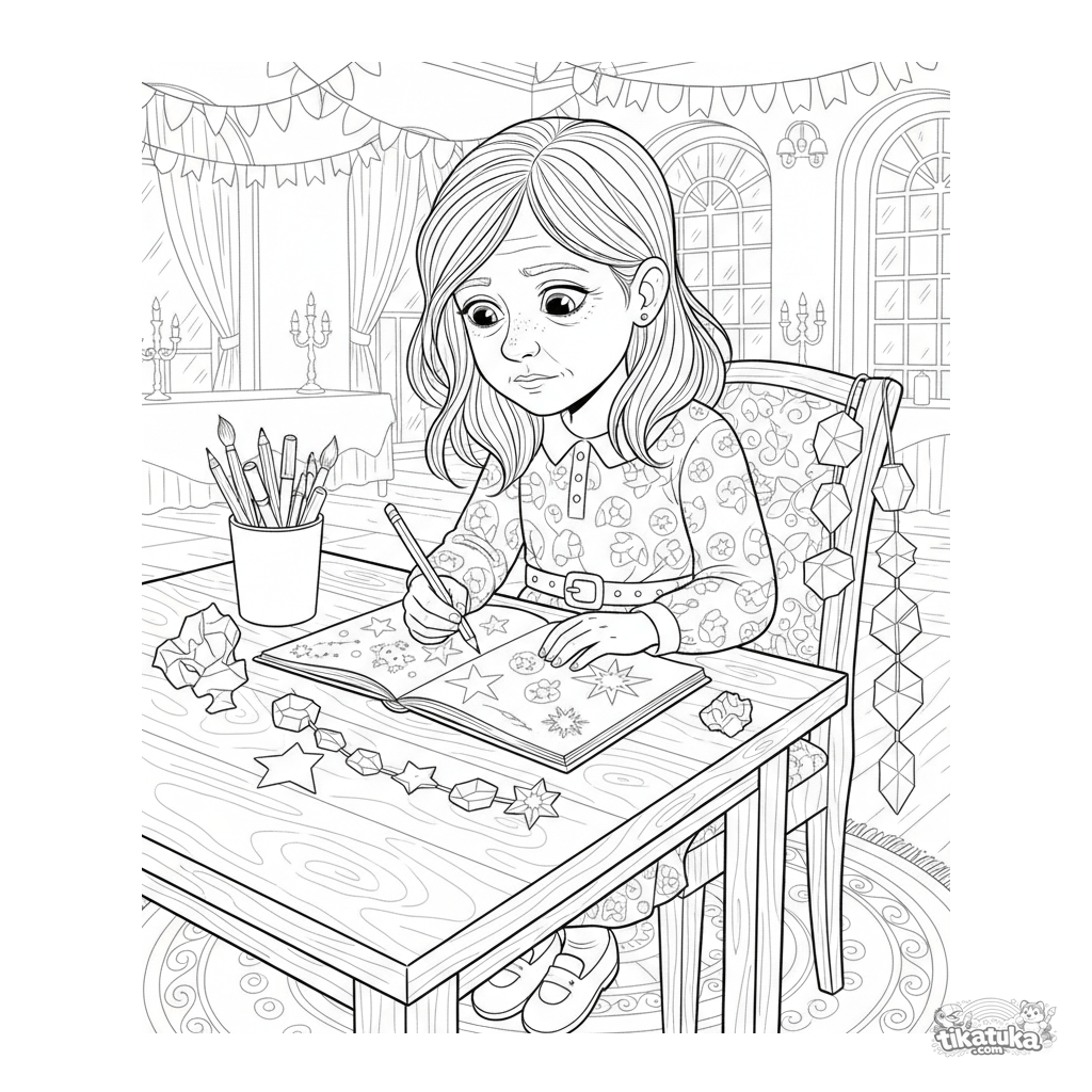 Página para colorear realista para niños mayores 10-12: una niña dibujando diseños de decoración en un salón festivo. Escena creativa.