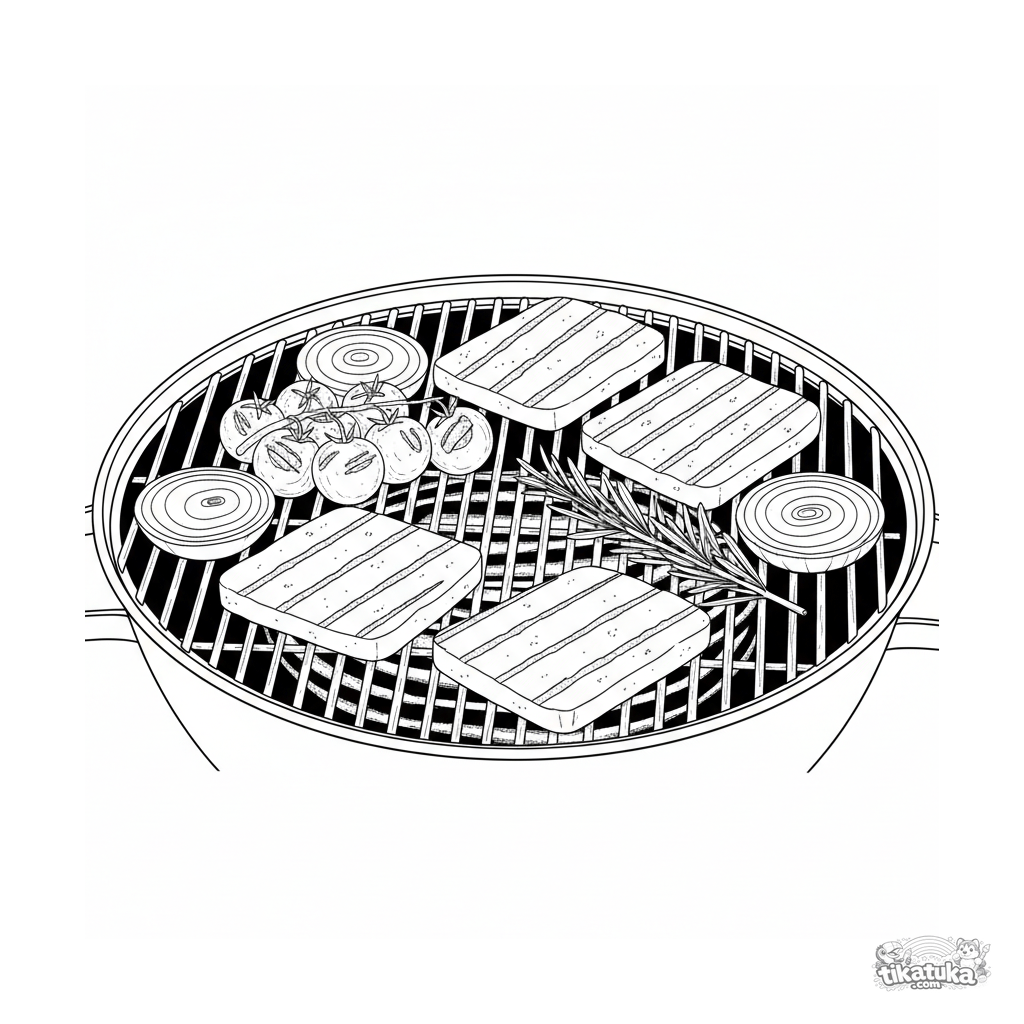 Página para colorear realista y detallada de queso halloumi y verduras en una parrilla de jardín. Para 10-12 años.
